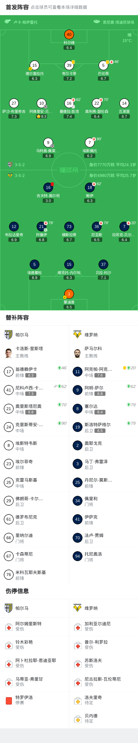 北京时间2月15日意大利足球顶级联赛第25轮,帕尔马主场对阵维罗纳。比赛中,帕尔马球员率先通过配合由阿德里安-贝尔纳韦打入一球;随后维罗纳球员吃到红牌,球队陷入被动;半场结束前,维罗纳依靠点球由阿鲁伊扳回一球;下半场补时阶段,帕尔马再次通过配合由马特奥-佩莱格里诺破门锁定胜局。最终比分帕尔马2-1维罗纳。